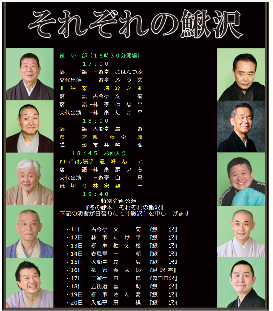 ・17日三遊亭白鳥『鬼コロ沢』 ・18日五街道雲助『鰍沢』 ・19日柳家さん喬『鰍沢』